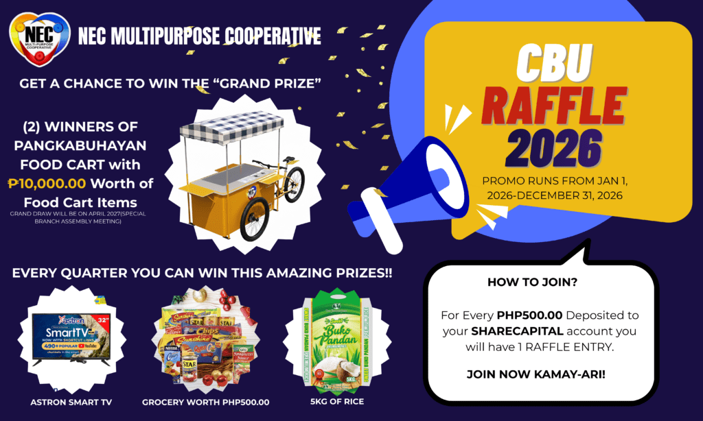 - Raffle tickets will be available at NEC MPC Bulacan Branch. Staff members will be assigned to assist members in acquiring tickets and provide relevant information about the promo.